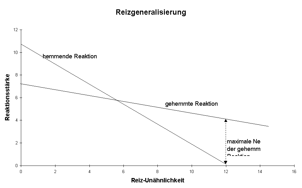 Die Netto-Stärke der gehemmten Reaktion liegt dort, wo die Reaktionsstärke der hemmenden Reaktion am kleinsten ist. Damit verschiebt die Person praktisch die Reizwahrnehmung bis zu einem Punkt, an dem die Reaktion nicht mehr gehemmt wird. Man spricht in diesem Zusammenhang auch von Reizgeneralisierung. Hat die Persönlichkeit sich an diese (unähnliche) Situation gewöhnt, so ist sie meist bereit, eine neue Situation aufzusuchen, die der Zieldimension ähnlicher ist. Dies setzt sich fort und es läßt sich nachweisen, daß der Gradient für die hemmende Reaktion sich senkt. Es geht in der Bewältigung der Konfliktsituation also nicht darum, den Aufsuchen-Gradienten zu steigern sondern darum, Maßnahmen zu ergreifen, um den Meiden-Gradienten zu senken.