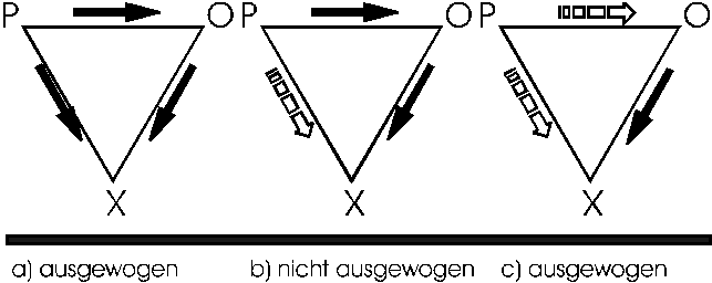 Konfigurationen, die im Widerspruch zu einer harmonischen Beziehung stehen erzeugen Spannungen und Unbehagen. Deshalb suchen wir uns Freunde, die uns ähnlich sind oder Dinge und Attribute besitzen, die wir selber mögen. Wir vermeiden Situationen, die uns Unbehagen verursachen und falls wir uns in einer solchen Begebenheit befinden, werden wir versuchen, sie so zu gestalten, daß wir uns behaglich fühlen. (In Abbildung 6 werden schematisch ausgewogene und nicht-ausgewogene Beziehungen gezeigt)