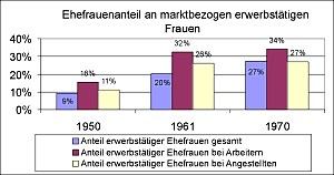 Der Frauenanteil unter der Gesamtheit aller Arbeiter und Angestellten, also den sogenannten "Abhängigen", nahm im Laufe der 50er Jahre rapide zu. 1950 betrug er 28,1 Prozent, 1961 bereits 34,2 Prozent. Jedoch rückten die Frauen wegen ihrer verhältnismäßig geringen Bildung nur in Arbeitsplätze der unteren Gehaltsklassen vor.
