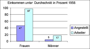 1956/ 57 verdienten 97 Prozent der weiblichen Arbeiter und 47 Prozent der weiblichen Angestellten weniger als der Durchschnitt, während lediglich 17 Prozent der Arbeiter und verschwindende 5 Prozent der Angestellten unterdurchschnittlich verdienten.