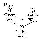 Damit die dialektische Dreiheit erhalten bleibt, werden griechische und römische Welt in einer Stufe zusammengefaßt. Das dritte, das christliche Zeitalter bringt "die Versöhnung des subjektiven Geistes mit dem objektiven" - womit die genaue Parallele zwischen dem Ablauf der Weltgeschichte und dem dialektischen Dreischritt der Hegelschen Geistesphilosophie (subjektiver, objektiver, absoluter Geist) erreicht ist.