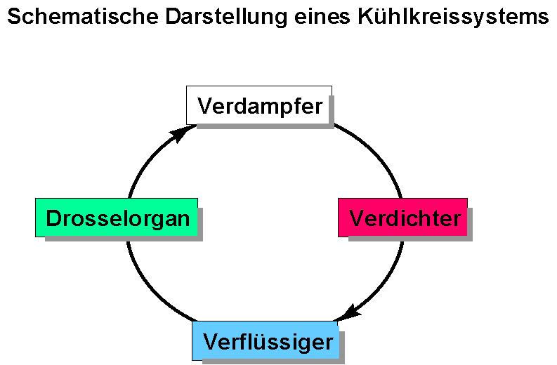Anhand des unten abgebildeten Kreislaufes beschrieben: Das flüssige Kältemittel gerät in den Verdampfer und entzieht dem Innenraum Wärme (kühlt). Der nun gasförmige Stoff wird im Verdichter unter hohem Druck wieder verflüssigt und gibt die dabei entstehende (dem Innenraum entzogene) Wärme nach außen ab. Das Drosselorgan mindert den Druck und gibt die Flüssigkeit erneut in den Verdampfer.
