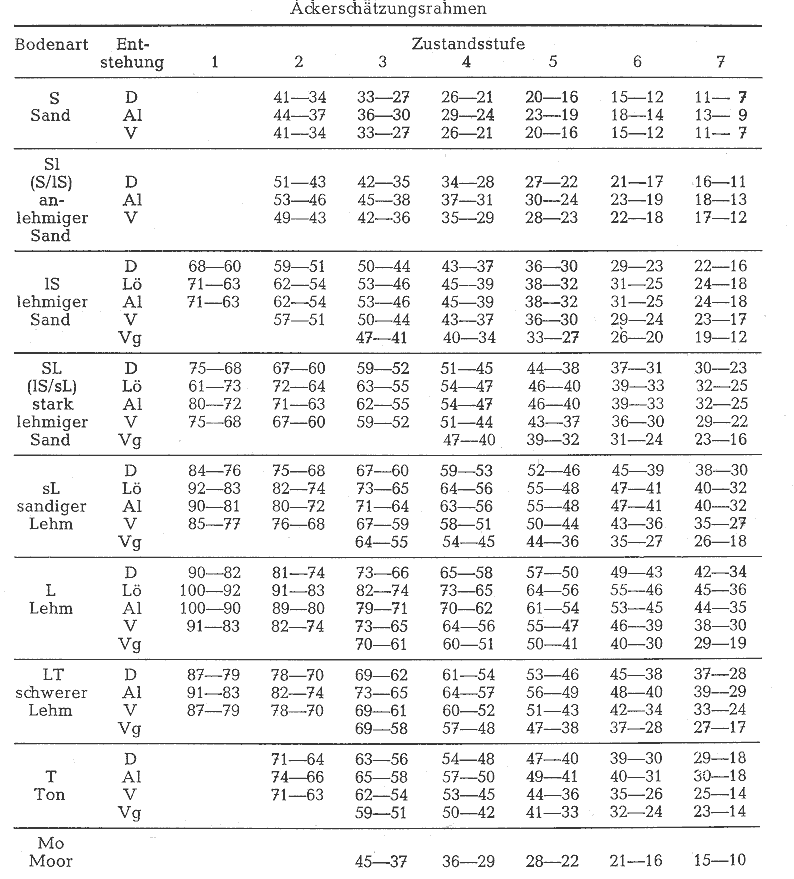 Bereits 1934 wurde das Bodenschätzungsgesetz erlassen, welches heute noch Gültigkeit besitzt (1965 durch das Bewertungsänderungsgesetz modifiziert). Nach ihm wird für Ackerland aus der Bodenart (Körnung), des geologischen Substrates und der Zustandsstufe die Bodenzahl ermittelt.