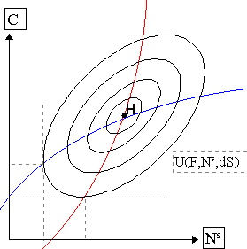 Alle anderen Arbeits-Konsum-Kombinationen liegen also auf einem geringerem Nutzenniveau und es ergeben sich die geschlossenen Indifferenzkurven aus Abbildung 3, die jeder Arbeitszeit zwei Kombinationen aktuellen und zukünftigen Konsums mit gleichem intertemporalen Nutzen zuordnen. Restriktionen äussern sich in dieser Darstellung als als zu den Achsen rechtwinklige Tangenten an die Indifferenzkurven (ausgehend von