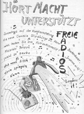 "Es ist paradox. Obwohl die Normalbürger wohl nur in den seltensten Fällen ein Freies Radio hören, wendet sich ein großer Teil des Programms an sie. Genauer gesagt wendet er sich nicht an eine öffentlichkeit, sondern an die öffentlichkeit. Wenn etwa Hausbesitzer eine Sendung machen, dann nutzen sie die Zeit nicht unbedingt ... zum gezielten Ansprechen von Leuten, die den Sender vermutlich hören, sondern dazu, um Verständnis zu werben, um über die Wohnungsnot und Häuserspekulation aufzuklären. Alles Dinge, bei denen die tatsächlichen Hörer wahrscheinlich ... nicken und sagen: sehr richtig, das muß den Leuten mal gesagt werden. Diejenigen, für die das Programm gedacht ist, hören es nicht. Die es hören, ... wird nicht viel neues erzählt ... auf die Sendungen können sie verzichten." (vgl. Hadamczik, M., 1983, S. 146)