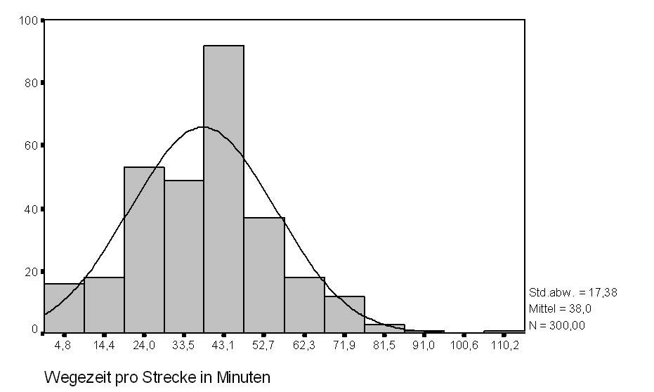 Die Anzahl der Stichproben beträgt 300 (N) . Die durchschnittlich benötigte Zeit beträgt 38,03 Minuten und die Standardabweichung liegt bei 17,38 Minuten. Die größte beobachtete Abweichung zwischen der empirischen und der hypothetischen Verteilungsfunktion beträgt 2,0644 (K-S Z emp) . a * ist gleich 0,0004 und läßt, da kleiner als 0,05 die Nullhypothese, welche eine Normalverteilung annimmt, ablehnen