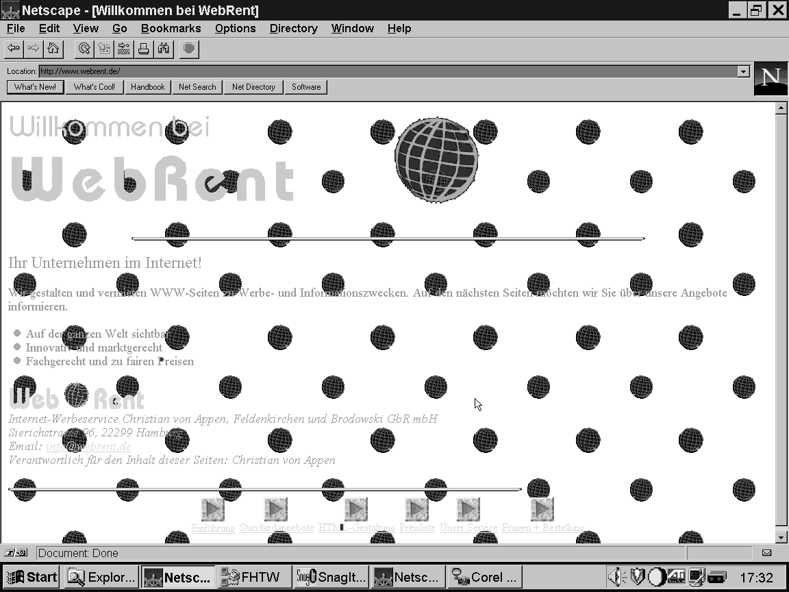 Serviceleistung der Firma WebRent:Individuelle Beratung:Im Vorfeld erarbeitet wir die für Ihr Produkt effizienteste Marketingstrategie, abgestimmt auf Ihre Unternehmensphilosophie, wobei existierende Präsentationen übernommen werden können. Gestaltung:Ihre Wünsche und Vorstellungen setzten wir in anspruchsvolle Internet-Seiten um. Dabei stehen uns sämtliche multimedialen Möglichkeiten des Internets wie Text, Fotos, Grafiken, Ton, E-mail, Formulare und Links zur Verfügung. Übersetzung:Um Ihre Präsentation auch auf dem internationalen Markt zugänglich zu machen, bieten wir Übersetzungen in Englisch, Französisch und Spanisch an. Gerne übersetzen wir auch Ihre E-mails, Broschüren, Anleitungen und Handbücher. Bereitstellung:Die fertigen Daten spiele wir Ihnen ins Internet ein. Eine regelmäßige Kontrolle garantiert die Stabilität Ihrer Seiten. Um einen hohen Bekanntheitsgrad zu erreichen, melden wir Sie bei den führenden 15 Suchprogrammen an. E-mail Verwaltung:Die an Sie gerichtete elektronische Post verwalten wir und stellen Sie Ihnen wöchentlich per Brief oder Fax zur Verfügung. Dadurch entfällt die Installation eines Internet-tauglichen PC-Systems in Ihrem Hause. Hardwarebetreuung:Für den Fall, daß Sie Ihre E-mail selbst verwalten und auch versenden möchten, richten wir Ihnen auf Anfrage gern die entsprechende Hardware ein. Konkurrenzanalyse:Wir beurteilen die Präsentation Ihrer im Internet bereits vorhandenen Mitbewerber und analysieren sie auf Stärken und Schwächen. 3.0 Statistiken zum WWW